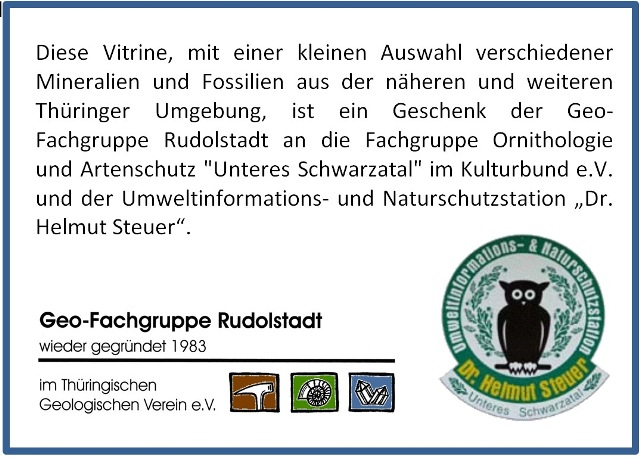 So durften wir im August eine Vitrine im "Bionik Kabinett" aufstellen, die verschiedene Gesteine, Minerale und Fossilien aus näherer und weiterer Thüringer Umgebung beinhalten.