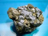 Fluorit (Flußspat) und Chrysokoll (Kieselkupfererz) in Lapillituff; Karbon, Gehren (links)